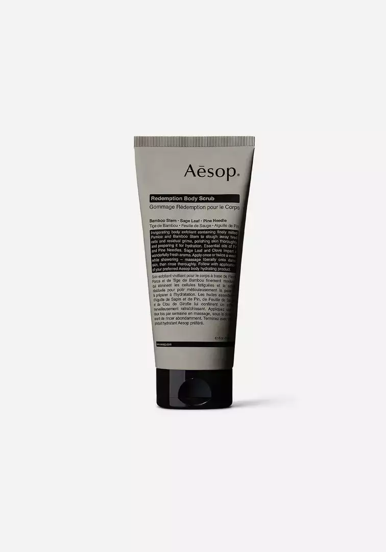 The Redemption Body Scrub by Aesop is a bracing blend of finely milled Pumice, Bamboo Stem and aromatic Pine Needle oil that sloughs away tired cells to leave skin polished and refreshed, perfectly prepared for hydration.Â