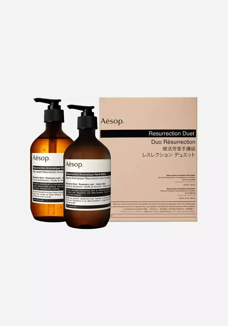 The Aesop Resurrection Duet is a delightful gift box duo to cleanse and care for the hands. Wash your hands lovingly with this mild cleanser then follow with a generous application of the rich, soothing balm. Each designed for frequent use to treat labour-wearied hands.