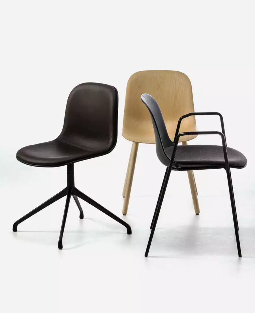 The variety of steel, solid ashwood or aluminium bases allows integration into any interior design project, from indoor to outdoor, from workplaces to the hospitality, from large contract use to residential. The polypropylene or 3D wood shell can be equipped with a fixed cushion or upholstered.Â