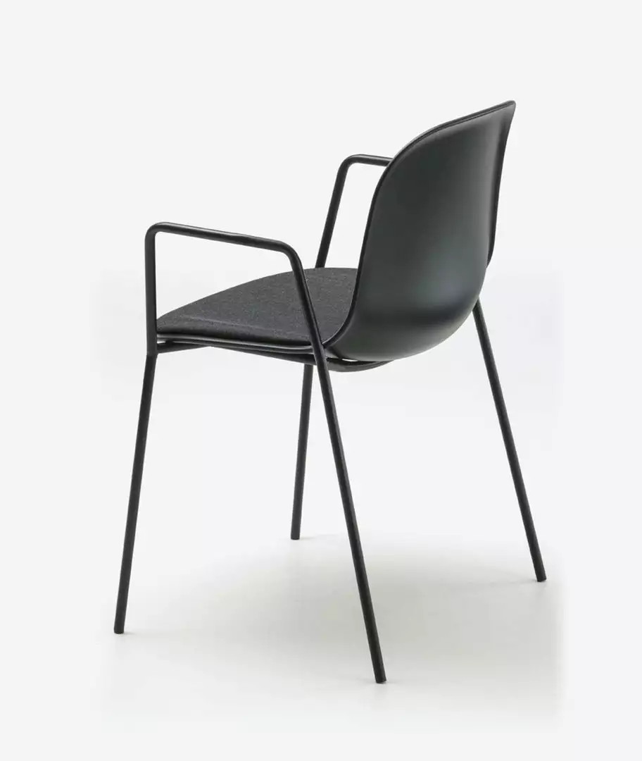 The stackable chair comes with a chromed or painted steel 4 leg frame with armrest. A polypropylene shell, available in a wide range of colours, can be upholstered or provided with a fixed cushion or with a sandwich-upholstered counter shell. It is possible to provide the chair with tablet and linking device system. This chair is suitable for outdoor use if combined with a painted steel frame and polypropylene shell, without a tablet.