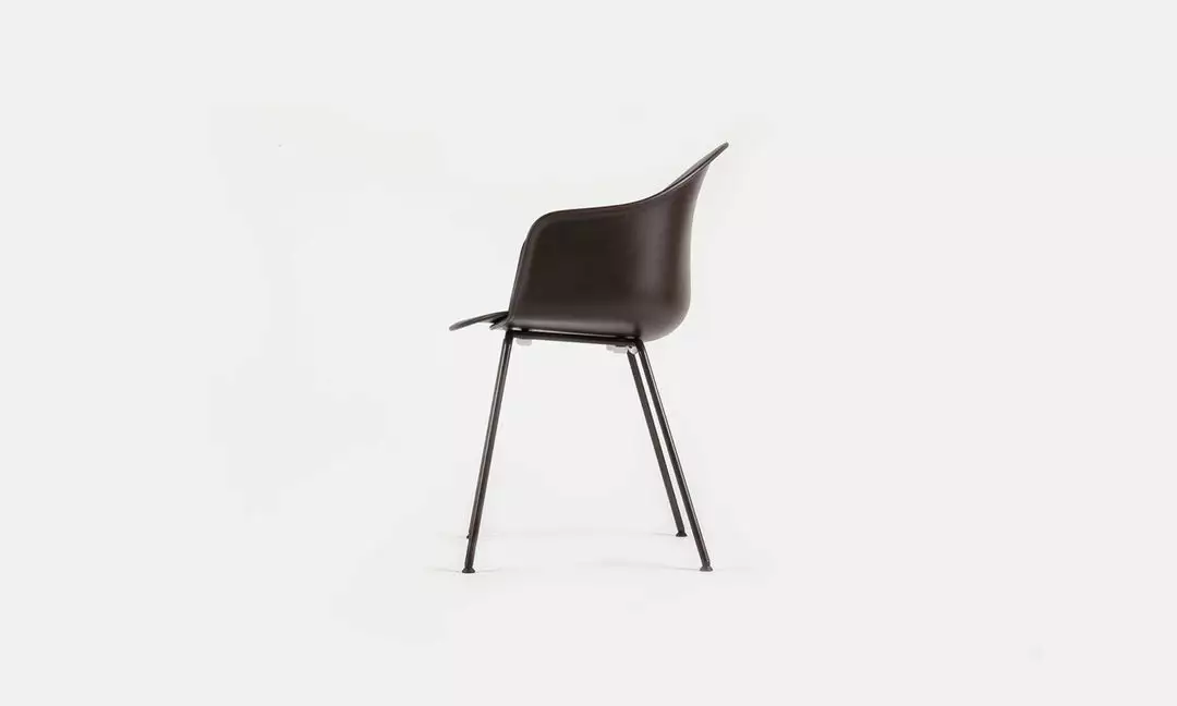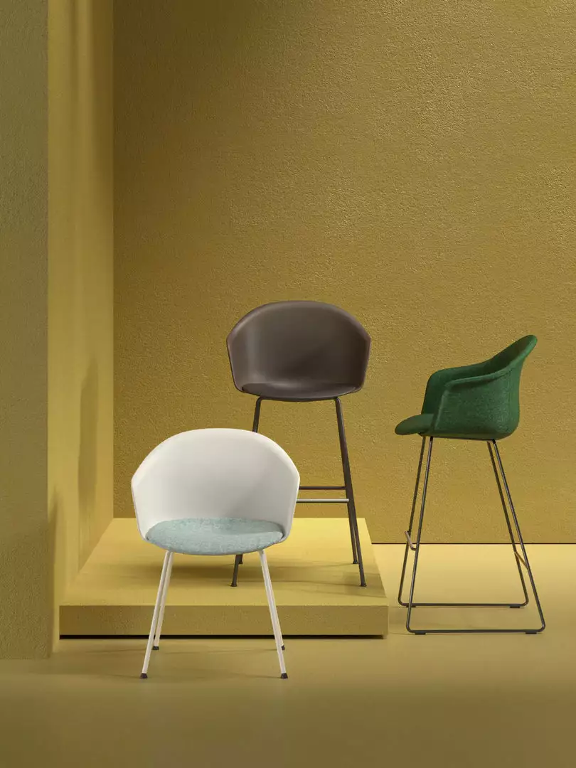 MÃ ni Armshell features soft, curving contours, providing comfortable seating to support even the most relaxed postures. The polypropylene shell produced from a single mould is accompanied by a choice of seats made of wood, upholstered or in tone-on-tone polypropylene in a slightly deeper shade. MÃ ni Armshell, which is also available in a completely upholstered version, can be combined with a range of chair or stool bases featuring wooden legs, metal sled base, swivel trestle base or castors.