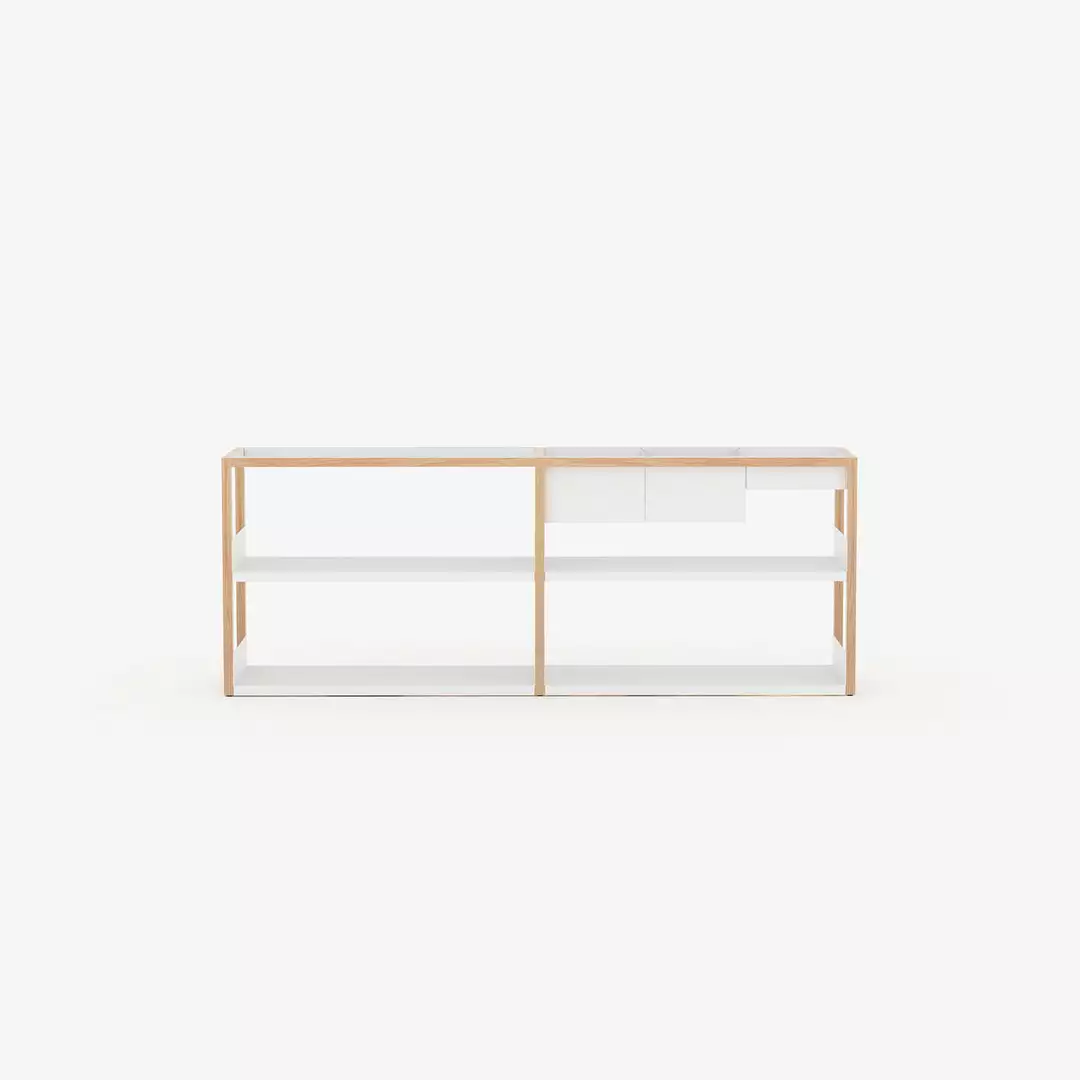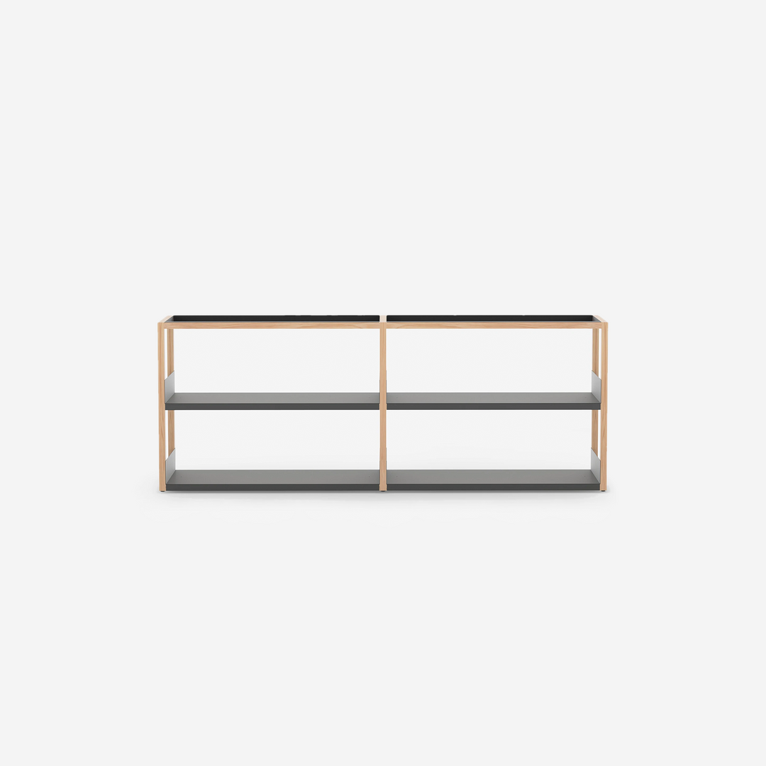 Marina designed the shelving system with this modularity and adaptability from realising the strange way people store objects in a box or on a tray that is then placed on a shelf. The name ‘Lap’ refers to how the metal overlaps the wood structure. How you arrange the components is up to you, and they can be rearranged at any time.Â
