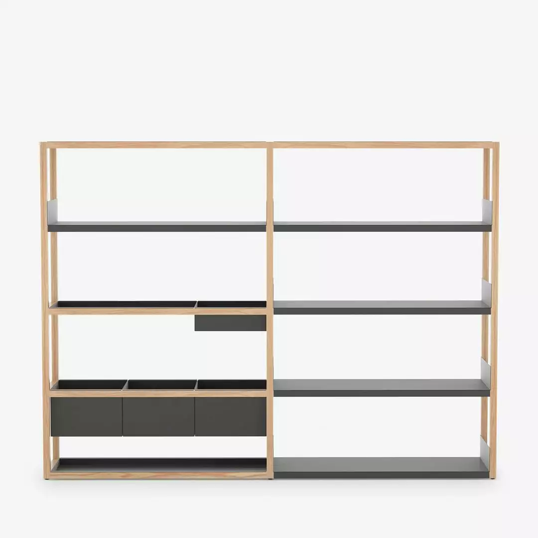 The Lap Shelving by award-winning designer Marina Bautier is a modular storage solution designed with simplicity in mind. Whether you need a single 1m shelving unit for an alcove or an entire wall of shelving in an office, the lap shelving is adaptable to work in different environments. Starting with a single unit, you can add extensions to provide you with enough storage. Choose from a frame filled entirely with sturdy steel shelving to house your collection of tomes, or a mixture of trays, deep and shallow boxes with shelves to store a variety of paperbacks and objects.