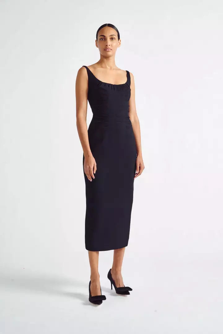 Inspired by classic romantic films, the Brooke Dress by Emilia Wickstead evokes timeless romanticism. A scooped neckline with ruched detailing frames the breastbone, extending to elegantly tapered sleeveless strapping across the shoulder. A concealed zip ensures discreet, seamless closure along the spine, enhancing its sleek structure, impeccably fitted in textured wool with a pencil skirt.