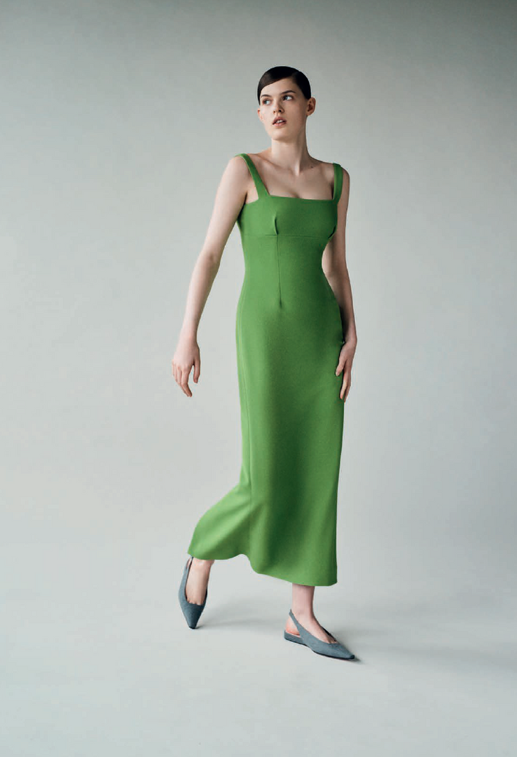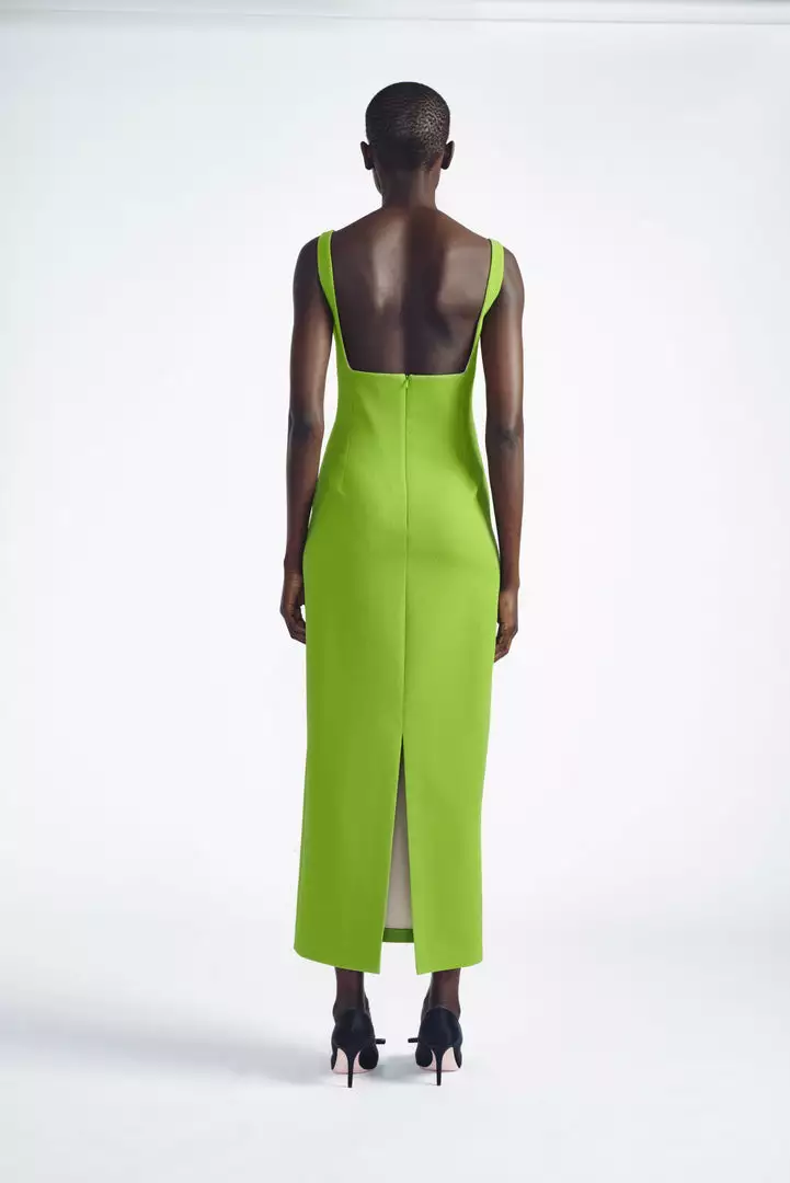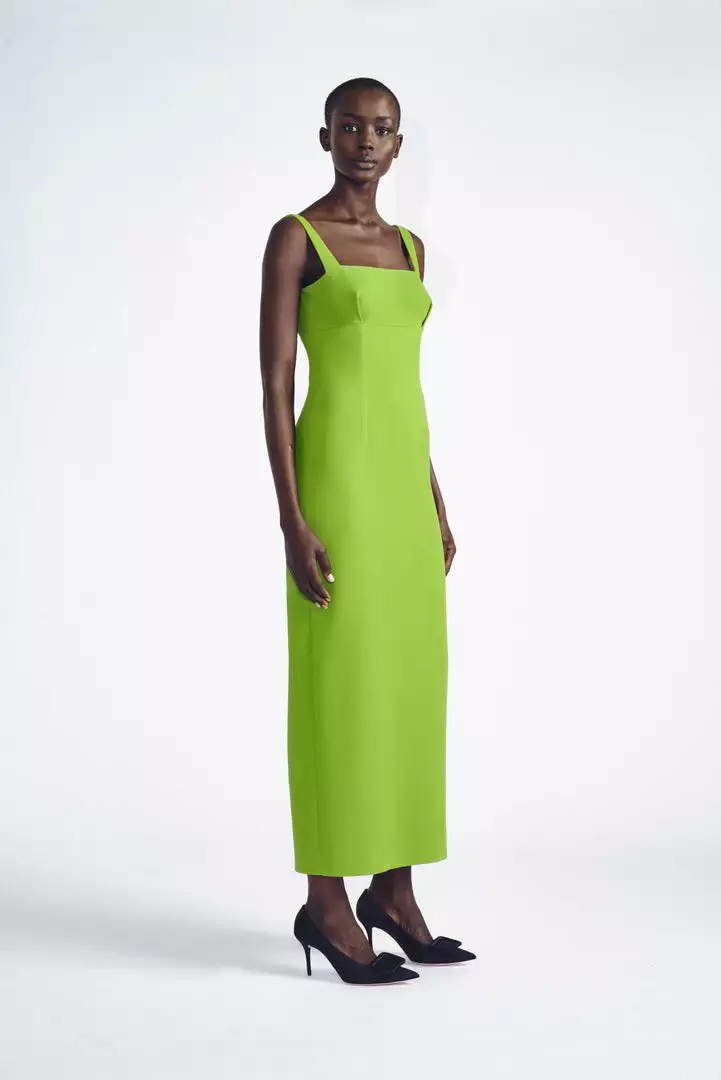 Expertly constructed to offer a clean and linear silhouette, the Magdalina dress evokes a sense of minimalist elegance. Crafted from a structural quality of double crepe in a statement-making shade of apple green, this column dress is finished with a square neckline and back vent. Pairs equally well with the Messina Flat or Vivienne Kitten Heel.