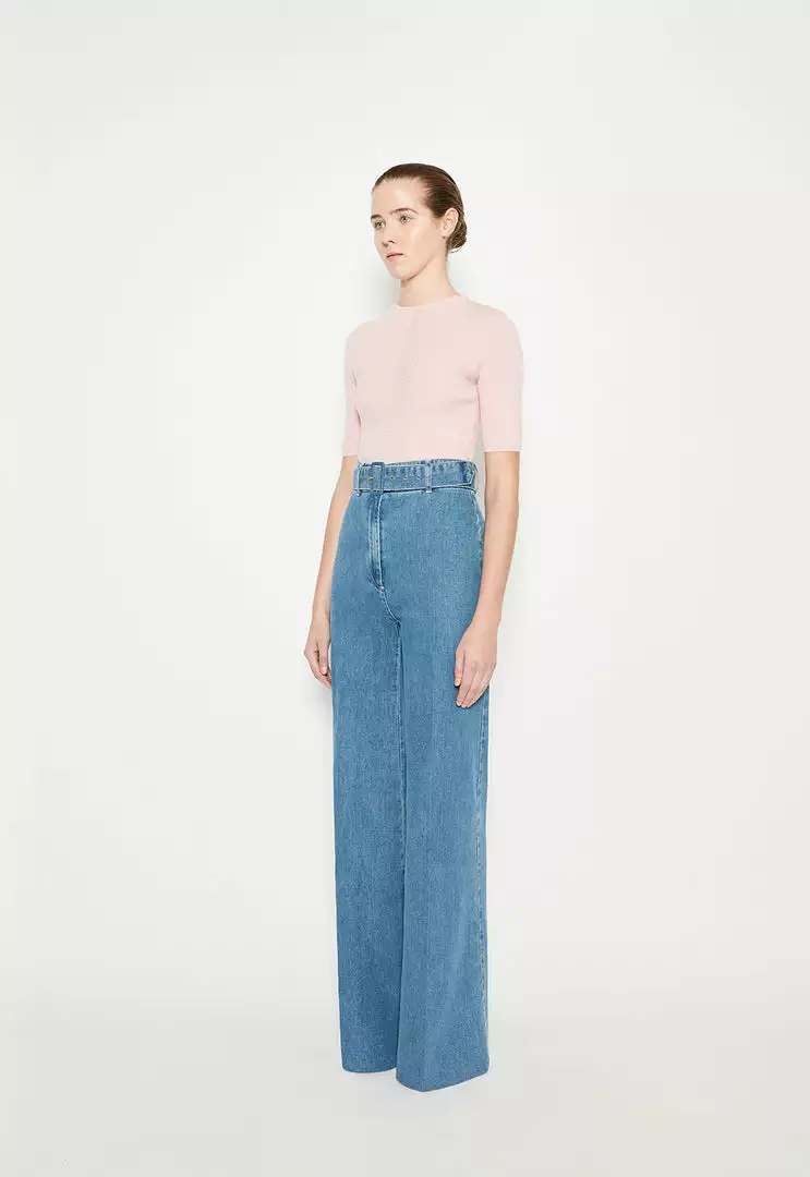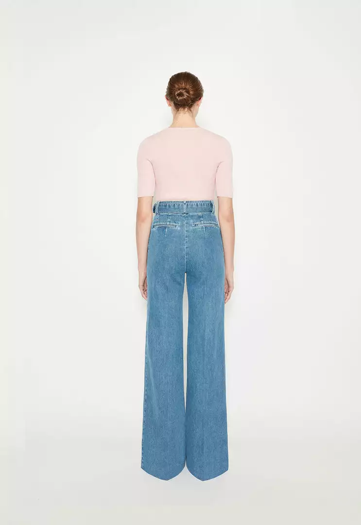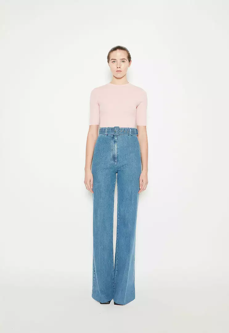 Emilia Wickstead’s precision tailoring informs the blue Jada jeans, stitched with darts at the waist for a refined take on classic American denim codes from the 1970s. Made in Italy with a touch of stretch for ease of movement and featuring a flattering silhouette with a detachable belt, concealed hook and zip fastening and dual rear welt pockets. The Jada sits high on the waist, falling to a wider, flared leg with neat pressed-front creases. Pair with heeled boots to complement Jada’s length.