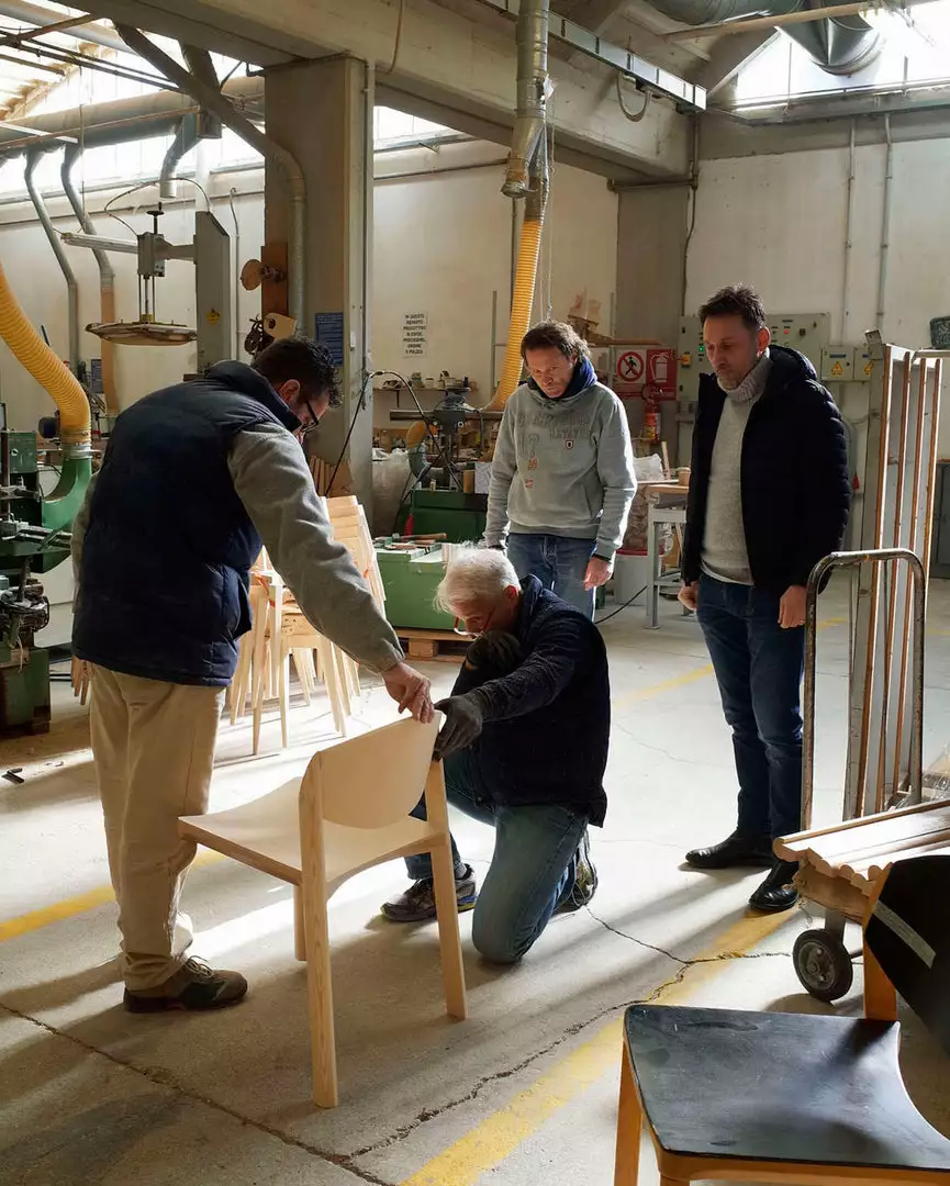 A self-confessed perfectionist, when Wrong and Gregorutti visited Pasquinelli for the first time, he told them about a prototype in his attic that he considered an evolution on the chair they had seen. The backrest on this later chair featured sophisticated curves, the seat was lighter, the legs more defined and there were elegant chamfered edges on the backrest. This is the chair that was to become Established & Sons’ Mauro Chair.