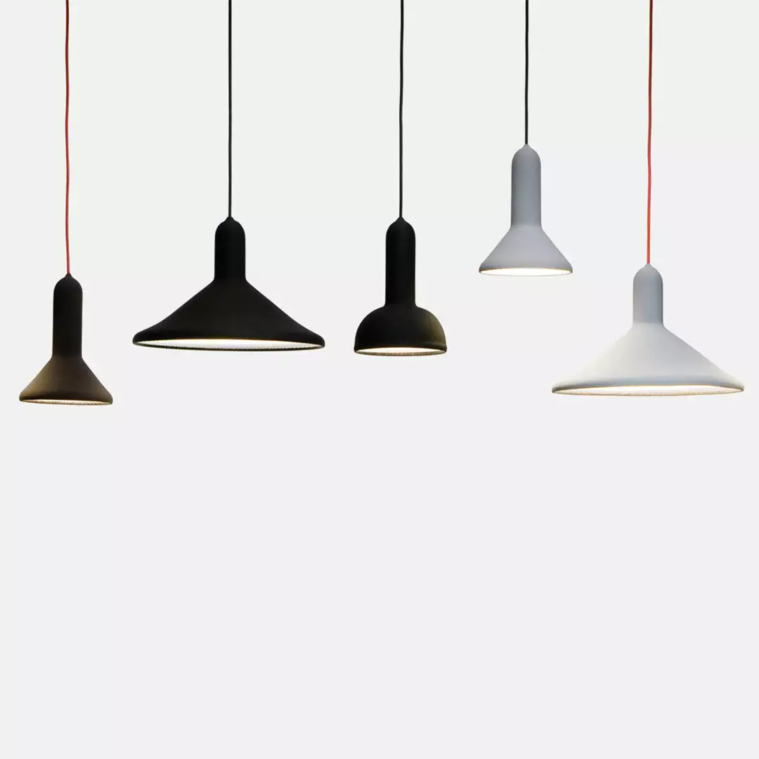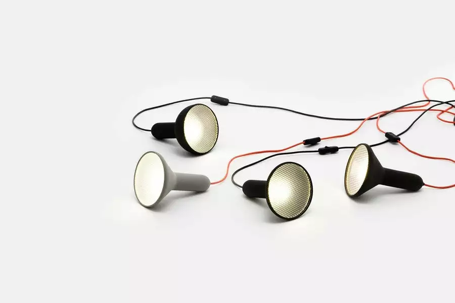 The Torch Light by Sylvain Willenz combines a tactile, PVC-dipped polymer shade with a diamond-textured diffuser – a reference to car headlights – and a brightly coloured cable, offering a wide array of colour and cluster combinations.