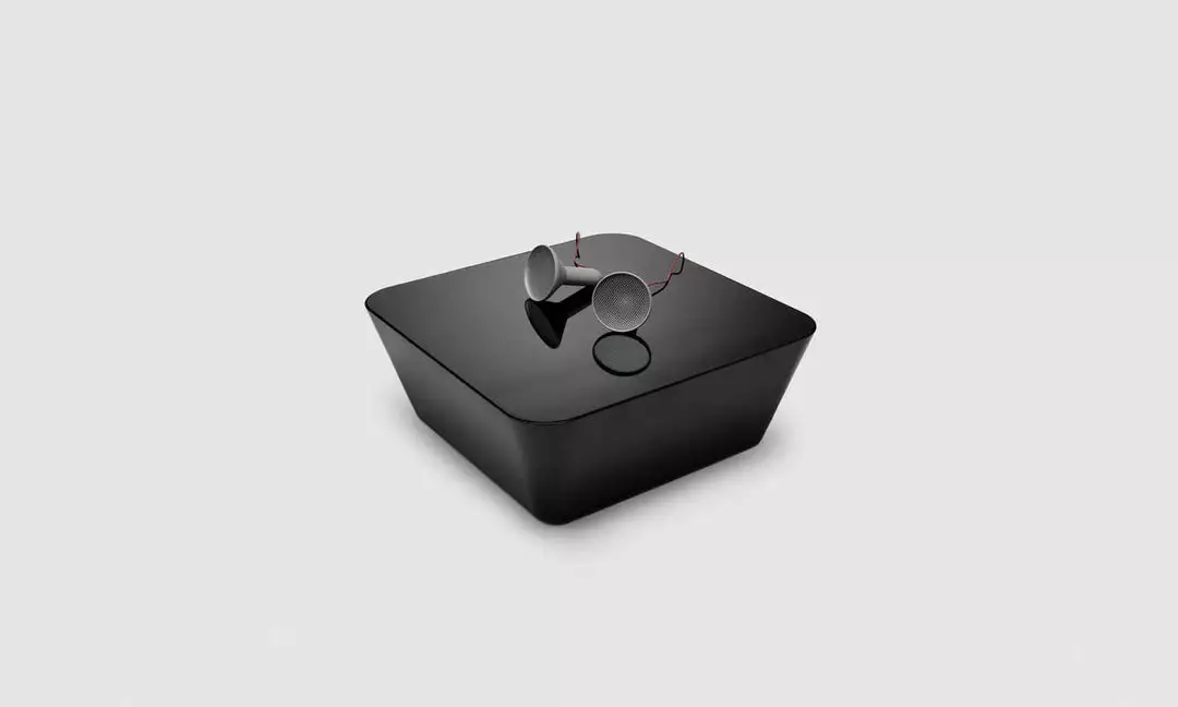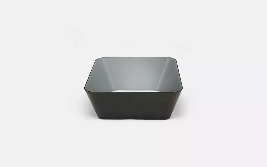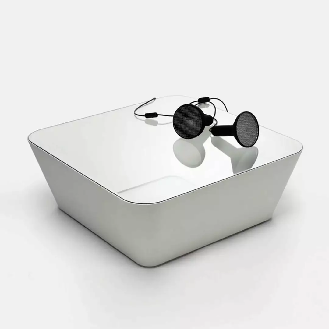 The Zero In Table by Established & Sons is constructed from an apparently seamless ribbon of moulded polyester with a high gloss finish, the Zero-In low table is an exercise in restrained form. The table appears to hover slightly above the ground. A glass top is barely visible, giving the impression that objects placed upon it are unsupported. Available in white, orange, grey, and black with black tinted glass.