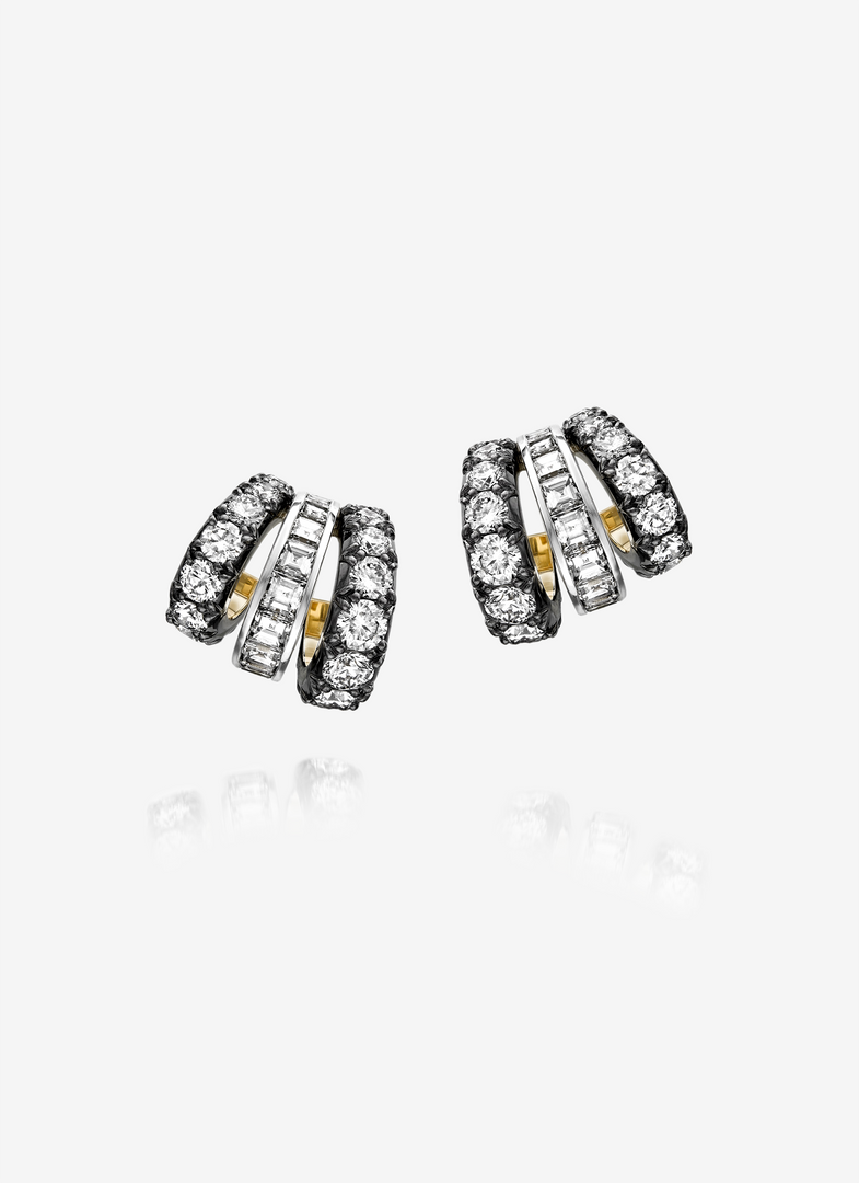 Melding Georgian-era characteristics with contemporary ideas, the Signature Diamond Tripset Hoops from Jessica McCormack are handcrafted in blackened 18K white gold, 18K white gold and 18K yellow gold.