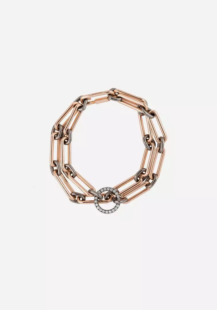 The Gem Clip Diamond Bracelet by Jessica McCormack is a beautiful double layer bracelet featuring a diamond pave-set rondelle of blackened white gold backed in rose gold. The circular diamond rondelle perfectly offsets the beautiful, handcrafted rose gold links. Wear alone or stacked with other styles, this pieces is effortless and timeless. Inspired by the first iteration of the humble paper clip, Gem Clip renders the clean lines of classic engineering in the most precious of materials. The collection takes its name and inspiration from the first version of today’s paperclip, designed at the close of the nineteenth century and trademarked in 1904 as the Gem Clip.
