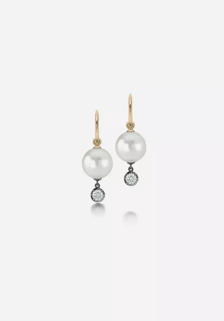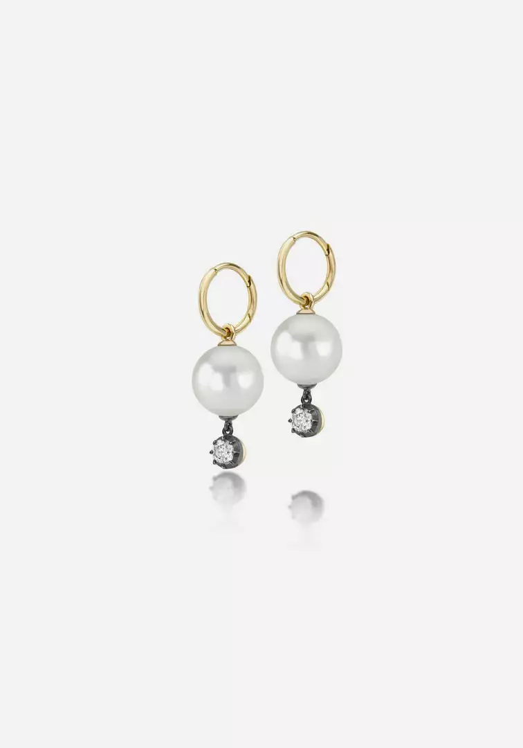 These beautiful Signature Pearl and Diamond 0.20ct Gypset Hoop Earrings earrings by Jessica McCormack are feminine yet modern. Each earring is set with a 0.20 carat brilliant cut diamond in Georgian cut-down setting, suspended beneath a round pearl. Handcrafted in 18k blackened white gold and 18k yellow gold. The playful twist by McCormack sees the diamond at the bottom, ing the design playful and modern.