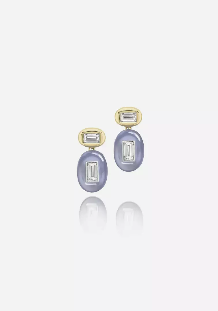 From the On The Rocks collection by Jessica McCormack these beautiful drop earrings are set with a 0.30 carat baguette cut diamond encased in a puffy, 18k yellow gold surround, linked to a 0.50 carat baguette cut diamond resting within a stormy blue coloured chalcedony drop, with a total diamond weight of 1.60 carats.The softly imperfect shapes, appear as if pressed and kneaded by hand, creating a pair of earrings that quietly elevate the everyday.