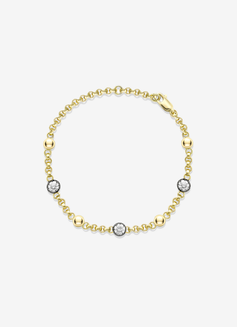 Delicate and beautiful, the Signature Jessica McCormack Three Stone Diamond Belcher Bracelet is a must-have jewellery wardrobe essential. The bracelet is part of the Signature collection, which mixes unique Georgian-era characteristics with contemporary style. The bracelet is punctuated with 18k yellow gold balls, and three Round Brilliant diamonds set in a Georgian cut-down setting for a softer look, with a total carat weight of 1.54 carats. Handcrafted in 18k blackened white and 18k yellow gold, the bracelet is 7 inches in length, with an adjustable jump ring at 6.5 inches ready to be worn for any occasion.
