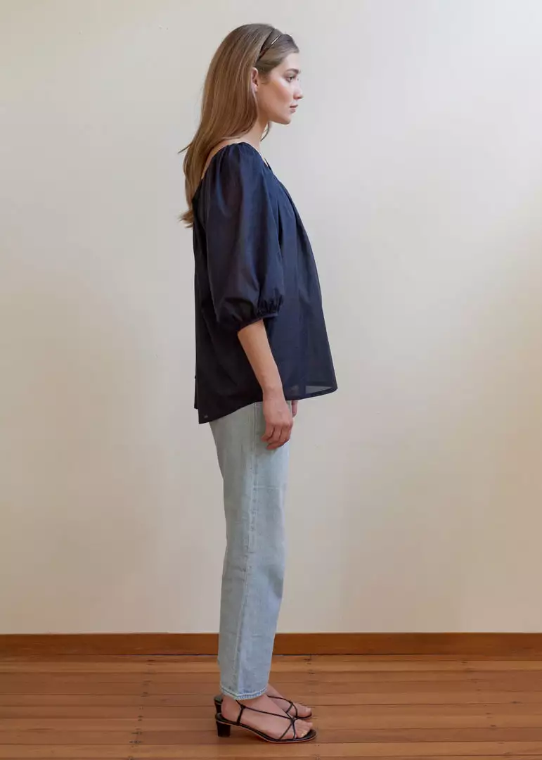 The Ballet Blouse is a gracefully simple style that draws attention to the collarbone and the curvilinear meeting of the neck and shoulder. Featuring a lightly gathered scoop neckline and 3/4 sleeve, the back dips to the upper-middle spine and is finished with fine binding and triple-tie detailing. Crafted in softest navy cotton voile for everyday comfort and ease.