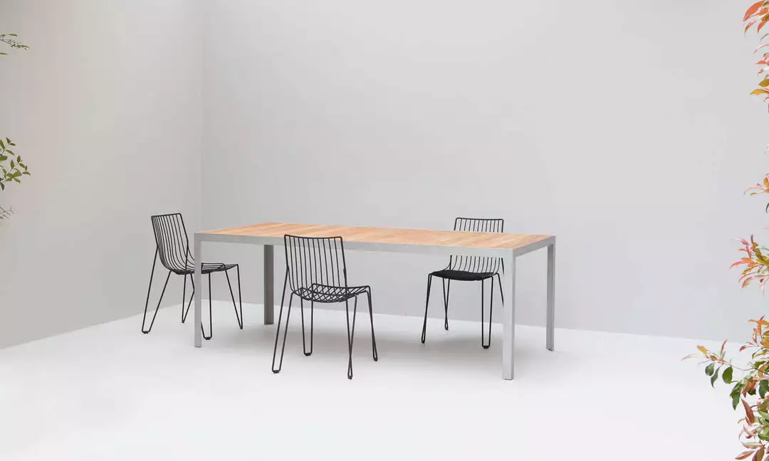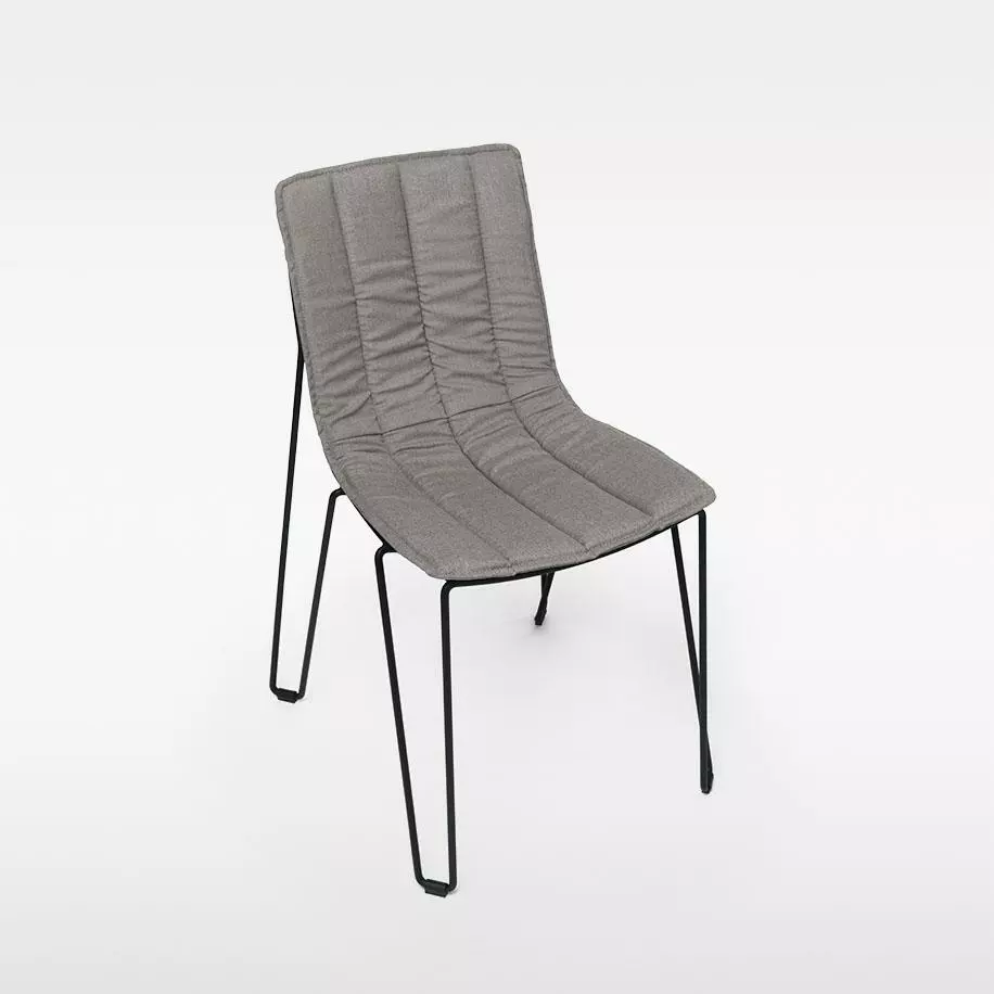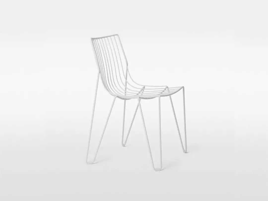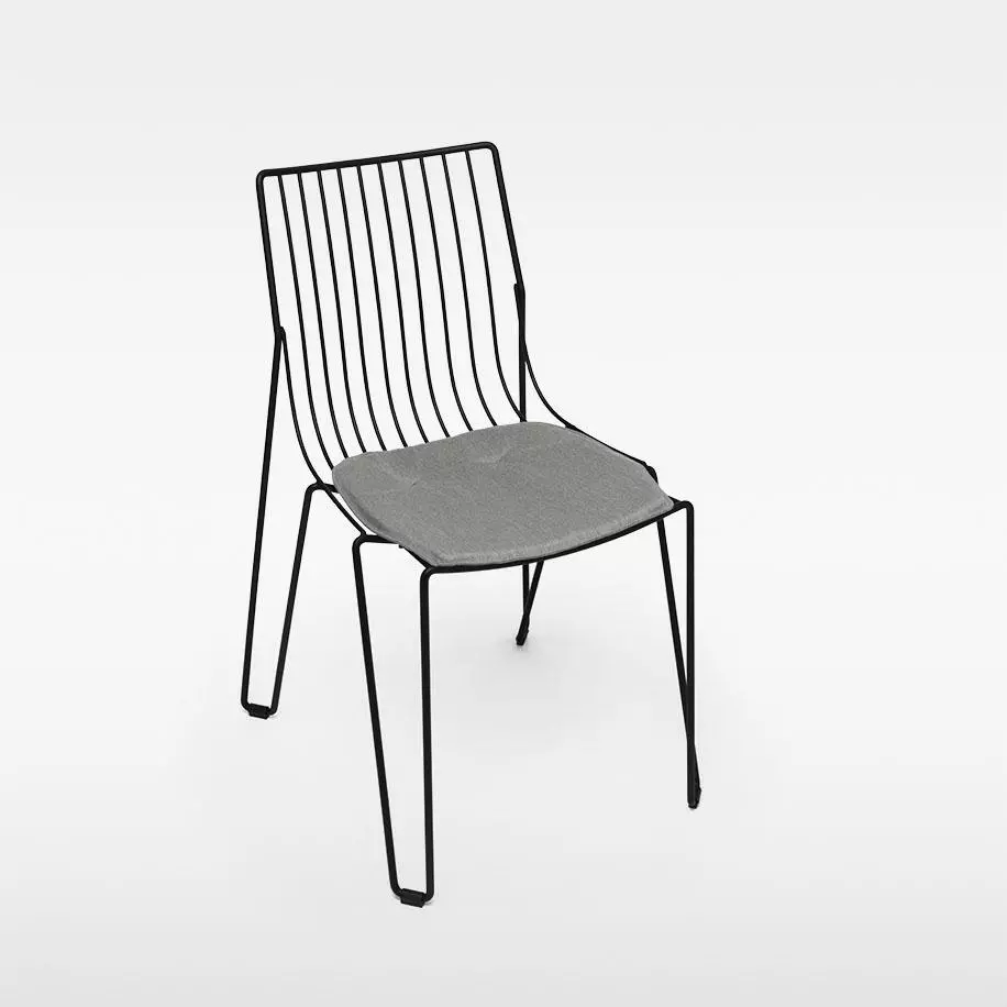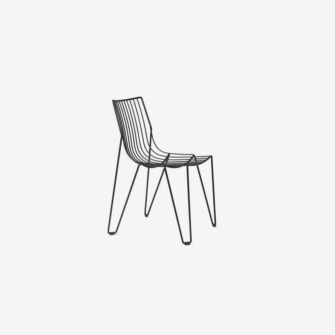 An elegant, stackable chair made solely from steel wire. Due to its transparency and clarity of design, The coveted Tio Chair by Massproductions blends in well with a large variety of architectural styles. Suitable for indoor and outdoor use. Galvanized metal wire covered with a polyester powder coat, available in black and white quick-ship and other colours or seat pads are imported to order.
