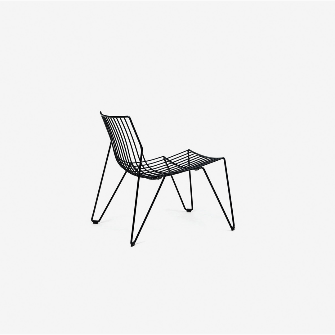 An elegant, stackable chair made solely from steel wire. Due to its transparency and clarity of design, The coveted Tio Easy Chair by Massproductions blends in well with a large variety of architectural styles. Suitable for indoor and outdoor use. Galvanized metal wire covered with a polyester powder coat, available in black and white quick-ship and other colours or seat pads are imported to order.