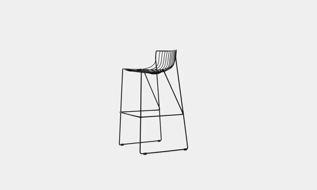 The Tio stool by Massproductions is a stackable bar stool for indoor as well as outdoor use, available in two sitting heights, 650mm and 750mm. The slender legs and graceful lines of this stool believe its inherent strength. Galvanised metal wire covered with a polyester powder coat, available in various colours.