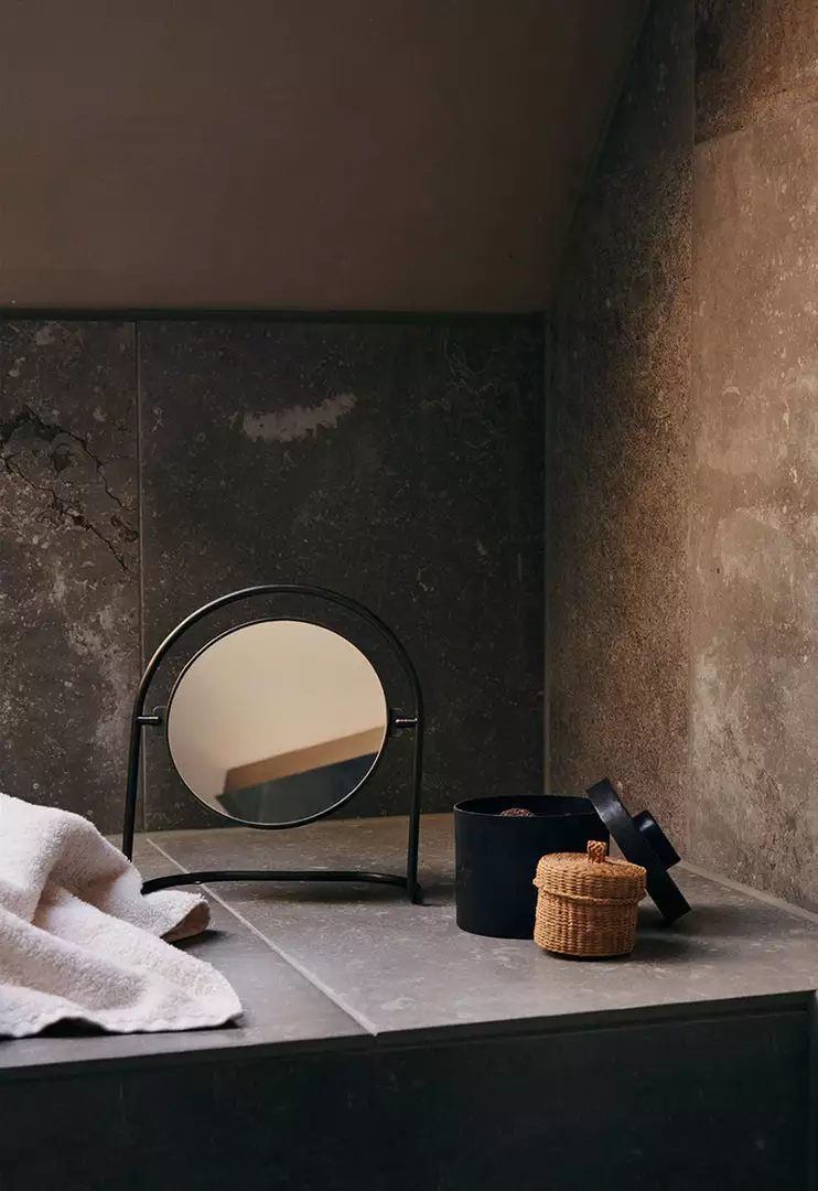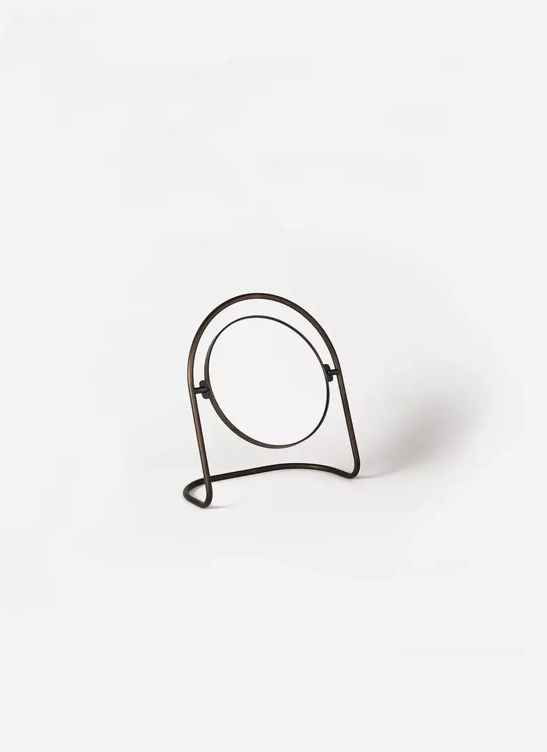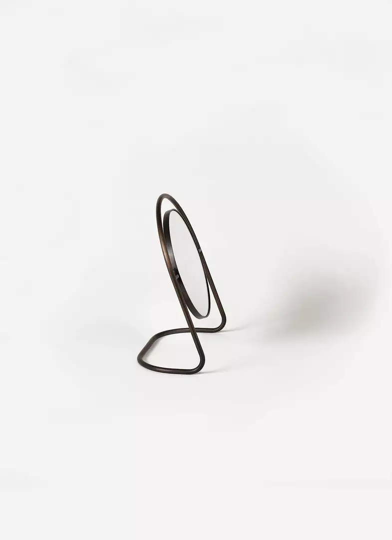 The Nimbus Table Mirror in bronzed brass is more than just a mirror, the gently curved halo-like stand brings elegance and visual intrigue to spaces, making it as beautiful to look at as it is to look into.