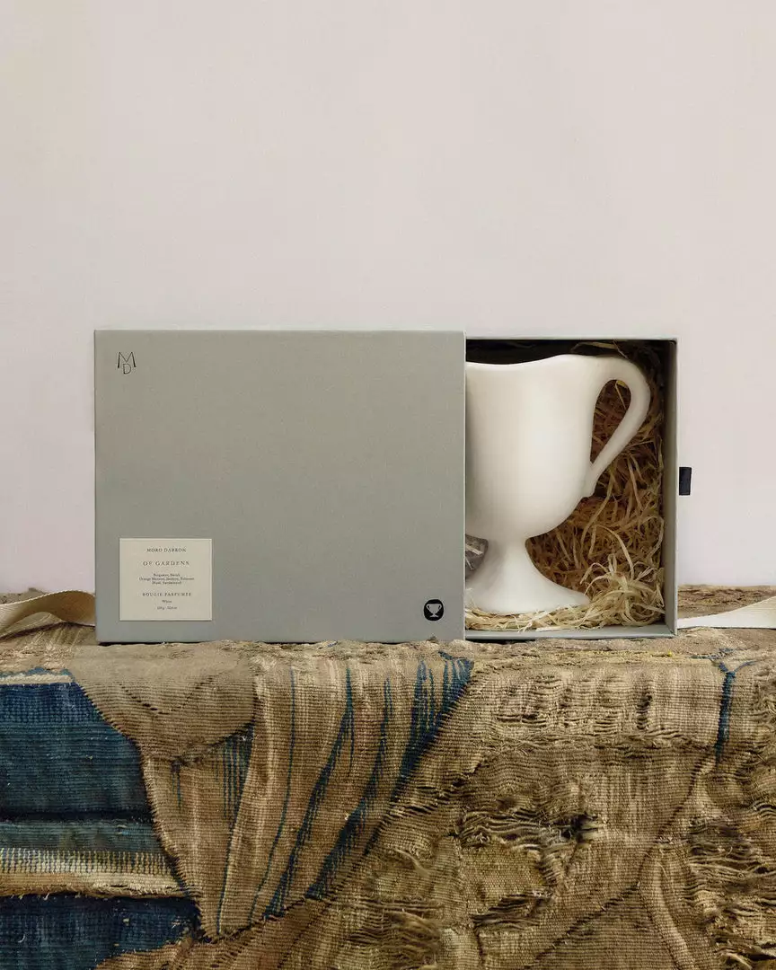 Uniquely warm and inviting, the Of Gardens candle by Moro Dabron is part of a collection of scents born out of a love for romantic interiors and gardens across time. Handcrafted from white Earthenware, the twin-handled Of Gardens candle vessel is poured, glazed and fired in an English pottery whose form acts as a gentle nod to the work of the late florist and author, Constance Spry.