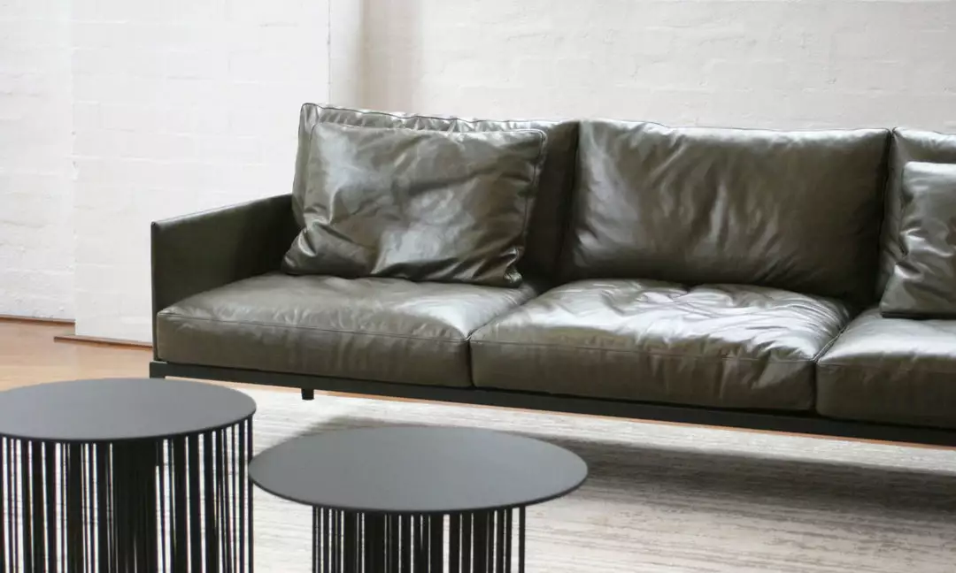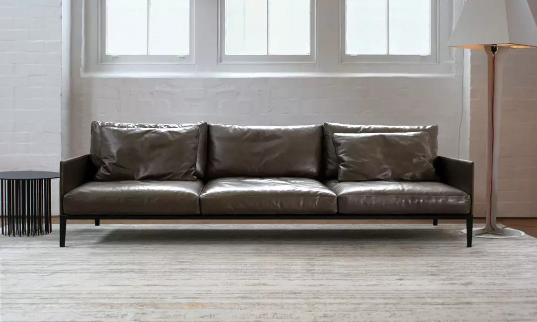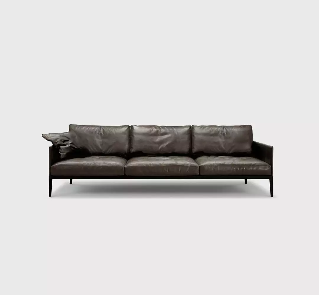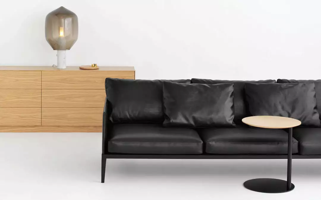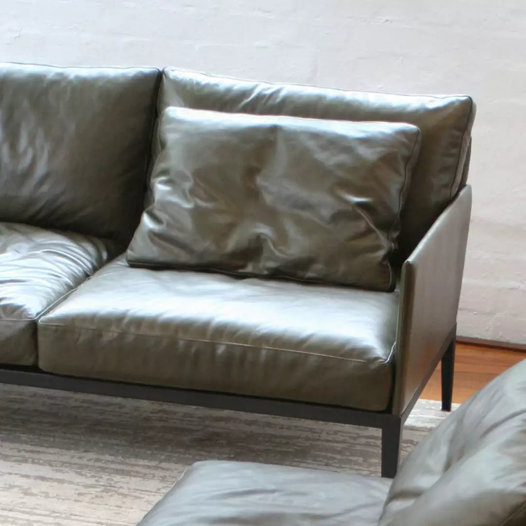 The Liaison Sofa by Cameron Foggo for Nonn is composed of a molded multi-density foam with feather and fibre in a channelled liner, against a black matte powdercoated steel frame that creates a design that has a polished, timeless look and luxurious feel. This sofa is available upholstered in either fabric or leather.