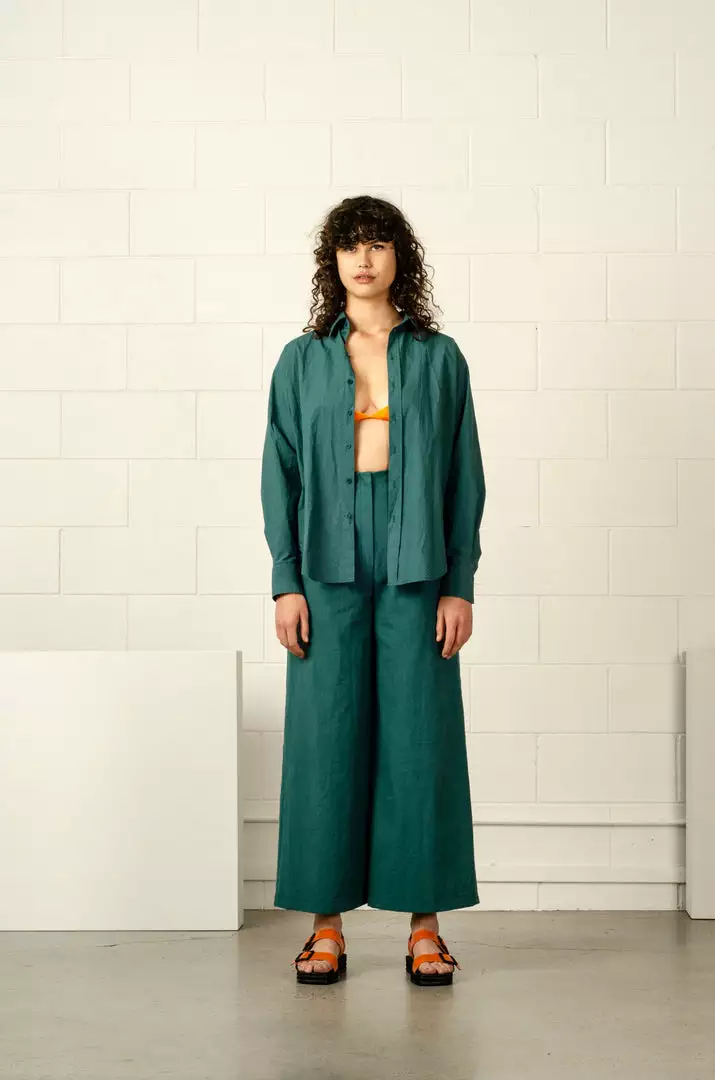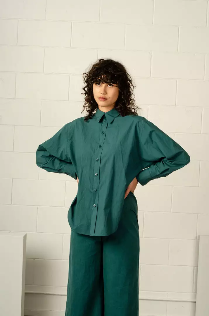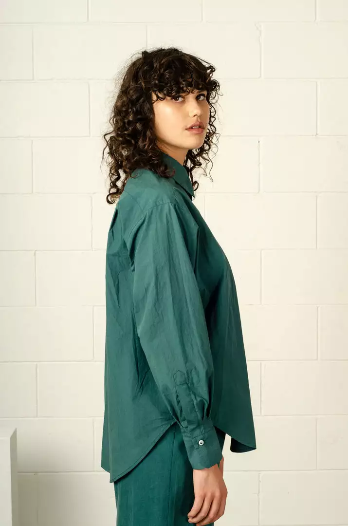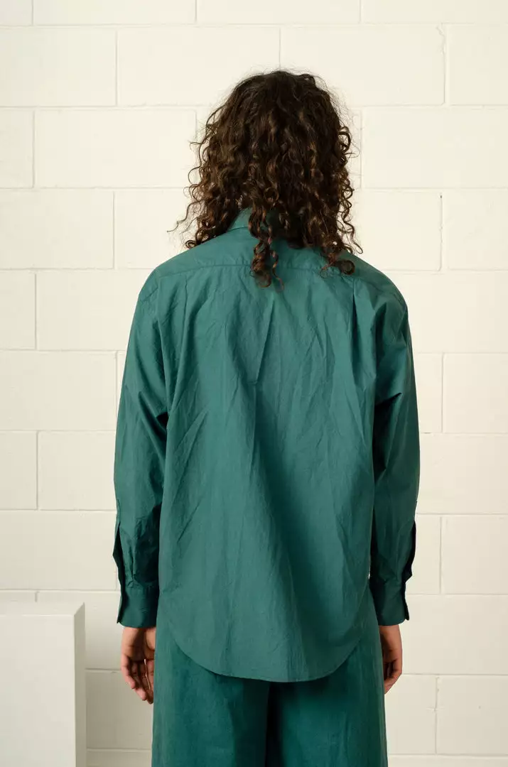 The Maryse Shirt by Penny Sage in striking teal is a classic everyday shirt with a slightly oversized fit. Fabricated in a crisp summer weight cotton to keep you cool and allow skin to breathe, shirt detailing includes buttoned cuffs, back yoke, pleats at the back and shell buttons. Style with the Dalton Skirt in contrasting stripe for a daytime summer, or with the sleek silhouette of the Tora Skirt from Emilia Wickstead for a cool but elegant pairing.