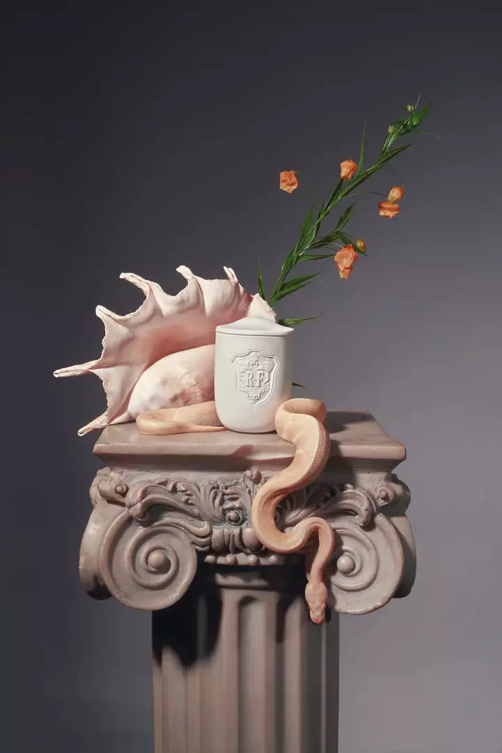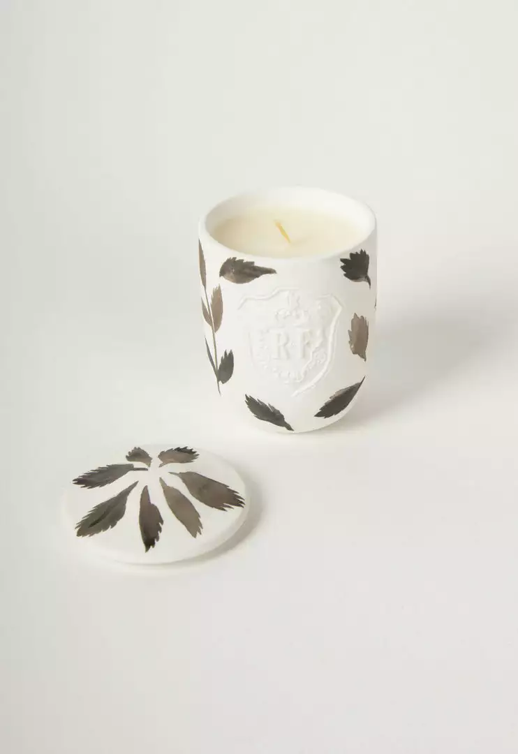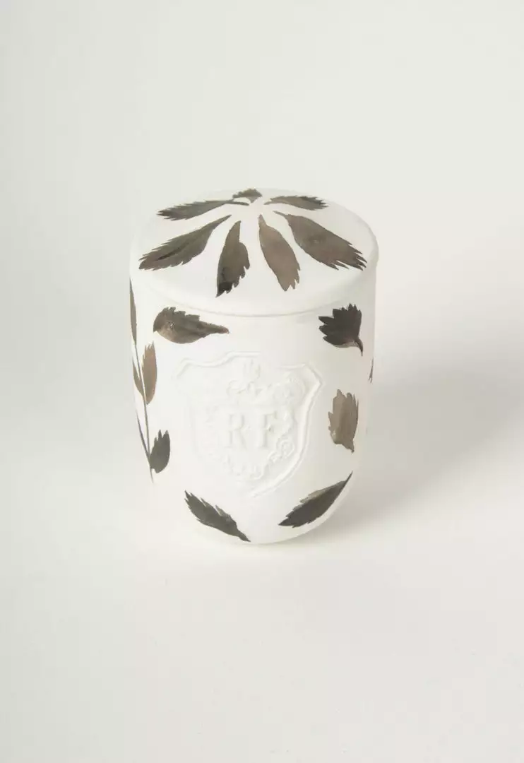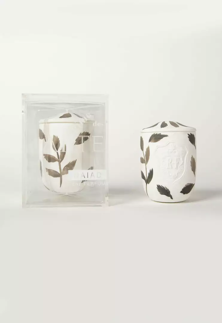 Naiad candle by fragrance house Regime des fleurs is hand painted in charcoal gouache on signature bisque porcelain vessel. Complete with intoxicating fragrance of iced Egyptian mint, frozen shiso, vanilla, elemi, olibanum, jasmine auriculatum, and vetiver