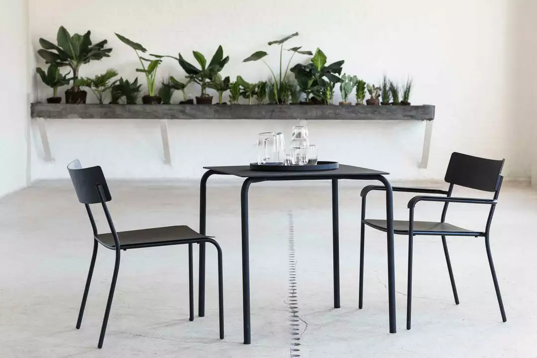 The August chair from the collection of Vincent Van Duysen for Serax are stripped down to the essence, but with contemporary proportions. The slightly wider seat and backrest ensure optimum comfort. The black powdercoat aluminium is weatherproof, allowing the chairs to be used both indoors and outdoors.