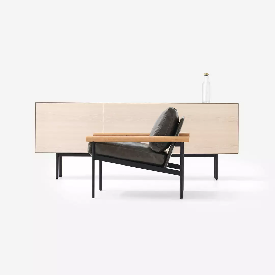 The Parallel Lounge Chair celebrates its robust steel frame rather than concealing it in the upholstery. The black steel frame is offset with the warmth and character of solid natural oak arms. The upholstered seat and back inner is made from a combination of feather and foam to give a superior soft comfort.