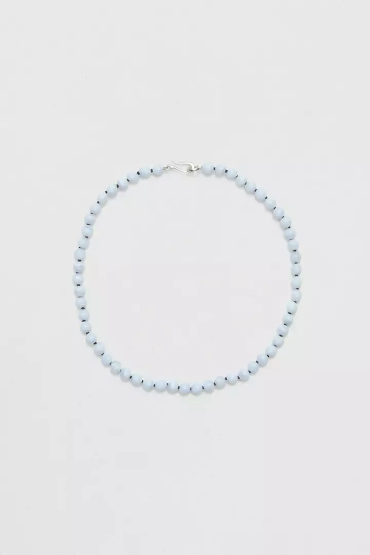 The Tiny Chalcedony Collar by Sophie Buhai is a fitted collar featuring small chalcedony stone beads. Sits above the collarbone and adorns the neck beautifully. Clasps with Sophie Buhai’s signature S-hook in sterling silver.Â