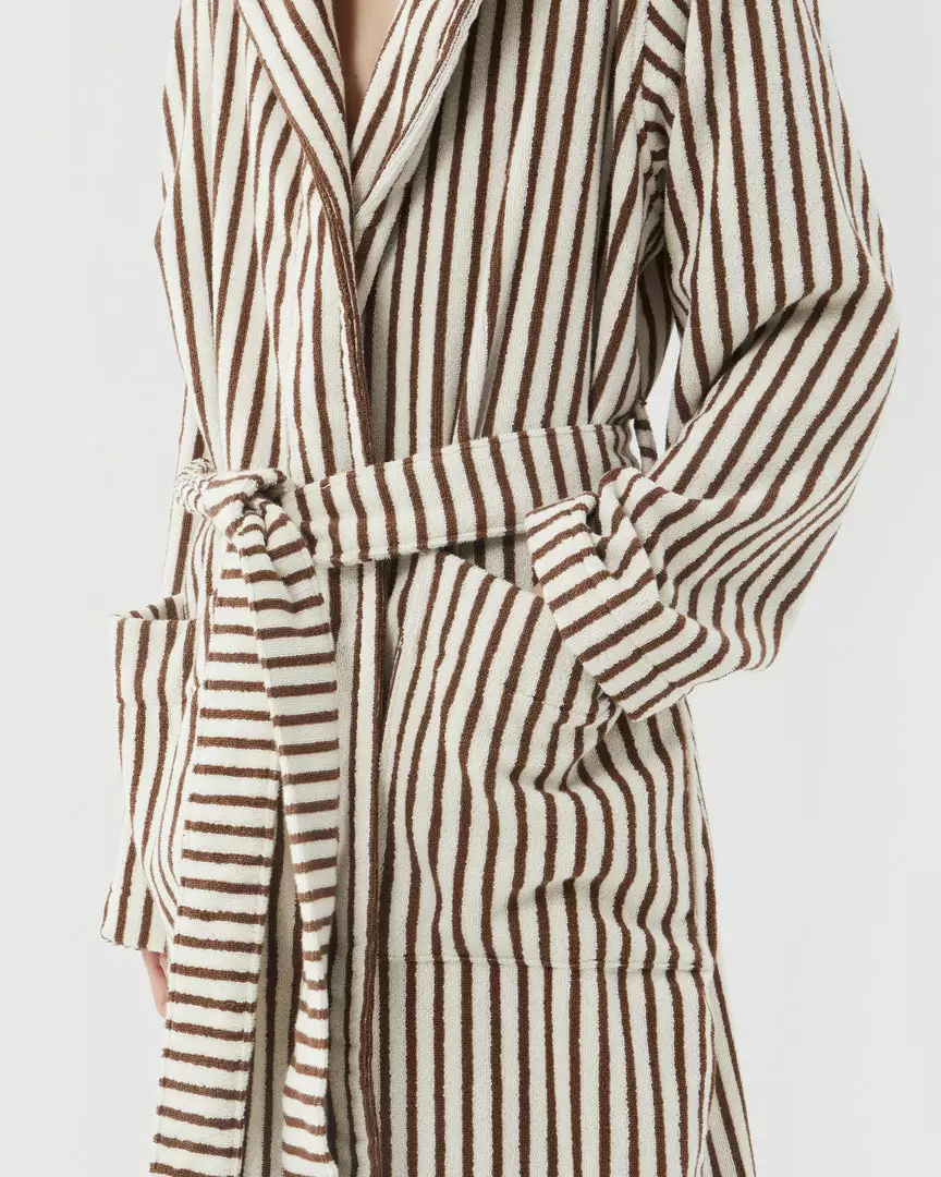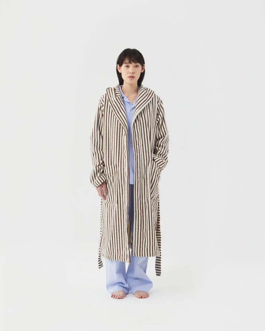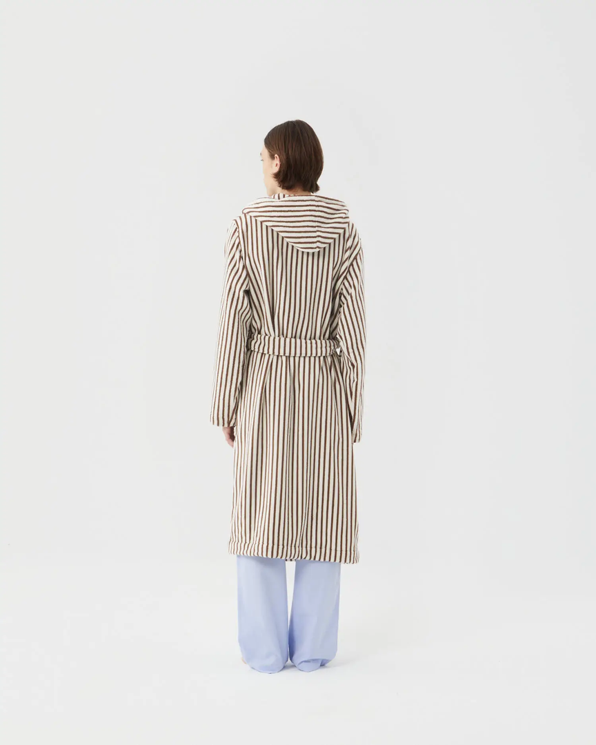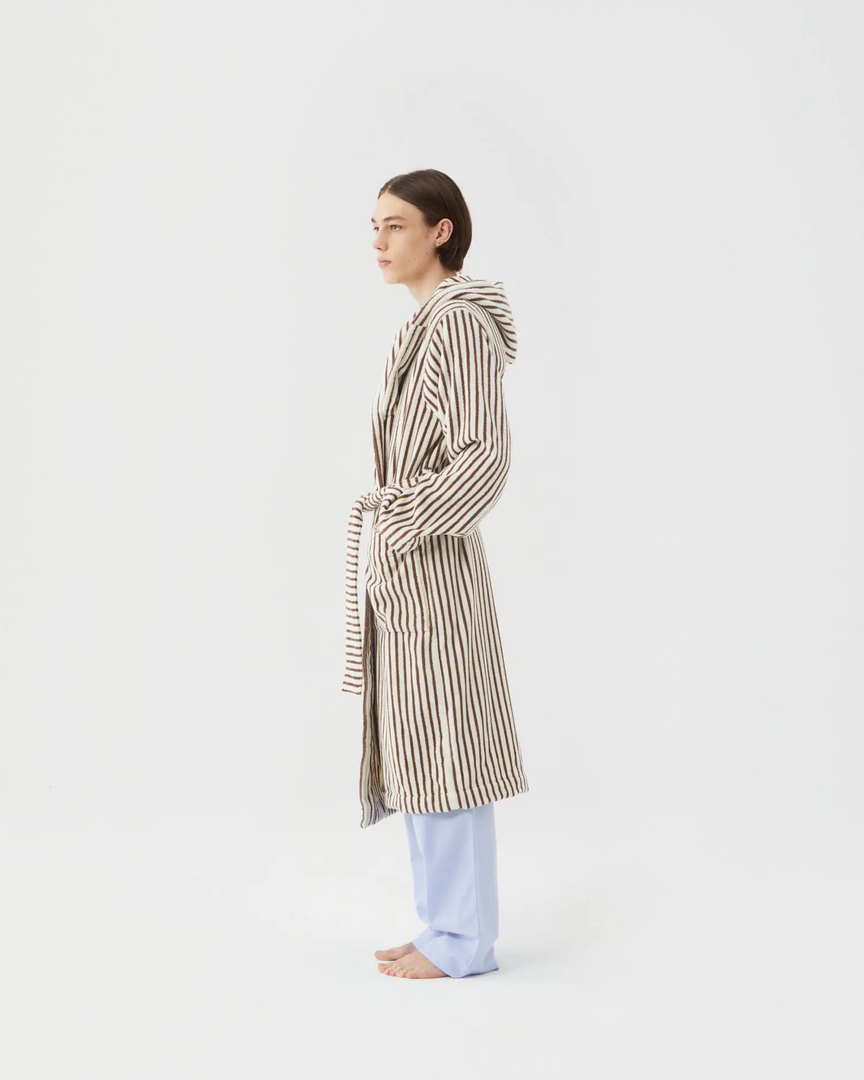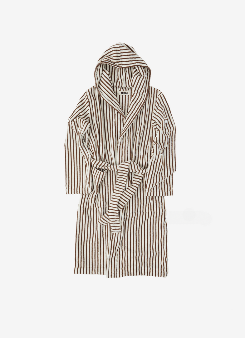 A unisex hooded bathrobe by Tekla featuring a directional cocoa and cream stripe with a cozy oversized fit.Â