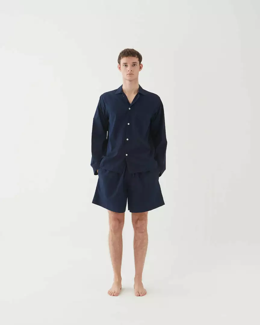 The breathable organic-cotton poplin weave of Tekla’s pyjama shirt creates a smooth surface ideal for lounging at home. It’s shaped to a loose silhouette with a patch pocket and classic collar and fastens with small white buttons.