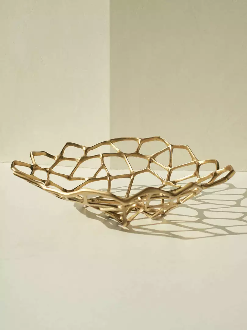 From Tom Dixon’s series of sculptural artefacts bearing a bone-like quality, the Large Bone Bowl is cast in solid brass with a matte finish. Each piece is formed into an intricate, curved lattice with an open structure that throws beautiful shadows onto any surface – adding great visual depth to any interior.