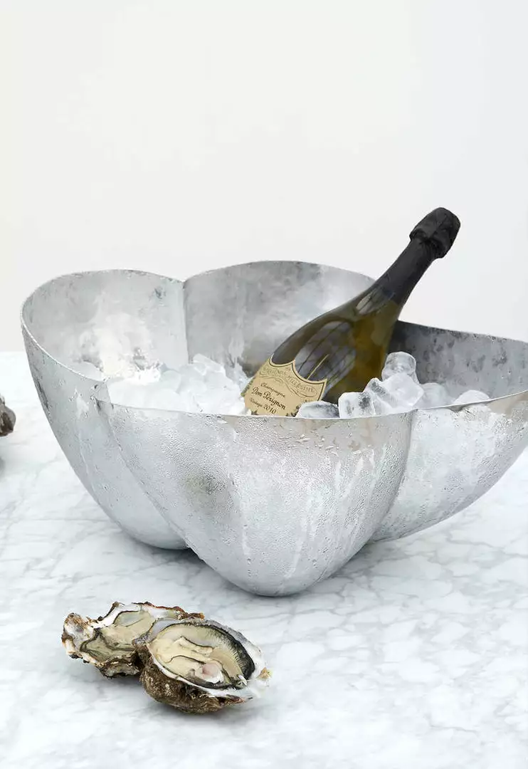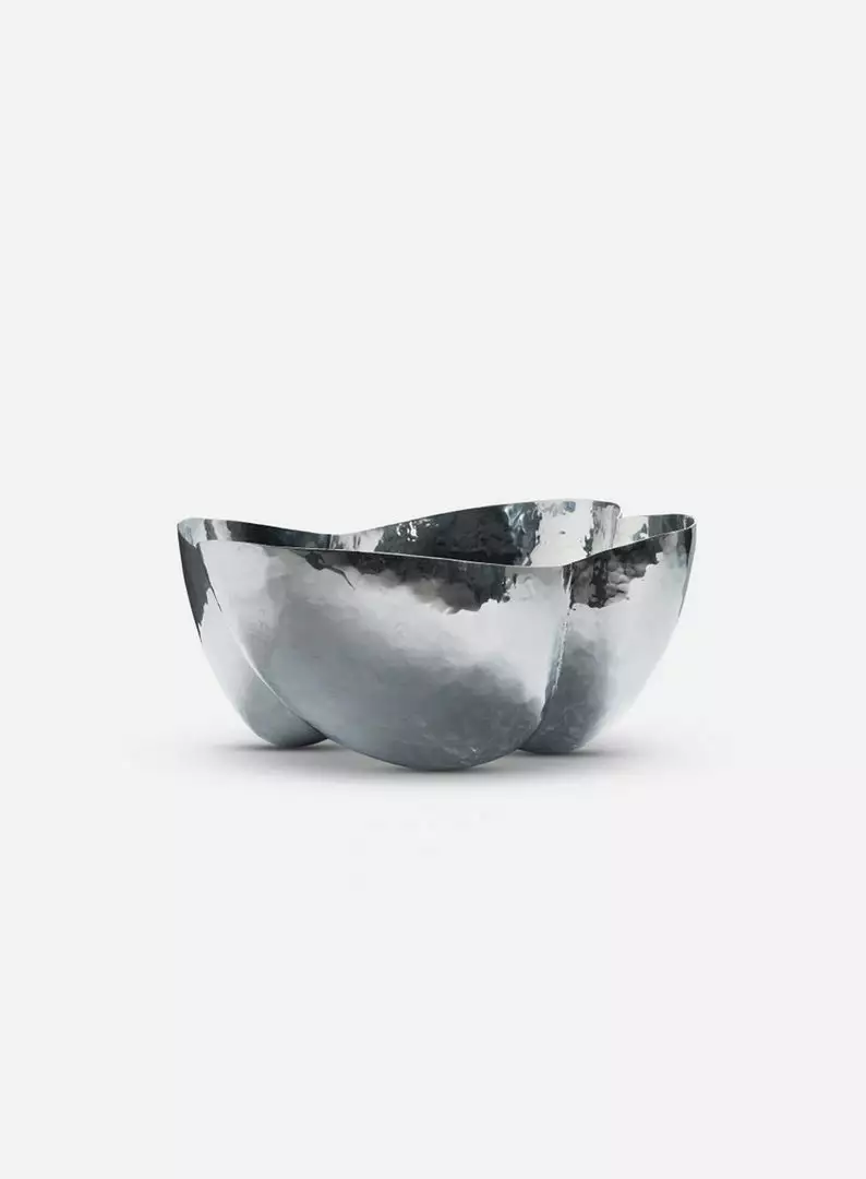 Cloud is a large sculptural bowl made of highly reflective polished aluminium. Handmade in India by skilled artisans, each bowl has unique qualities with every hammer and indentation from stretching and warping the metal being preserved, reflecting the amount of work that’s gone into the design. The silver bowl has a shape reminiscent of seedpods and can be used for a variation of purposes, such as a fruit bowl or ice bucket.