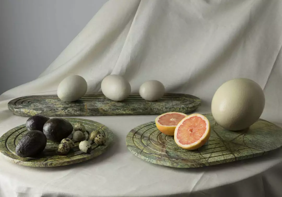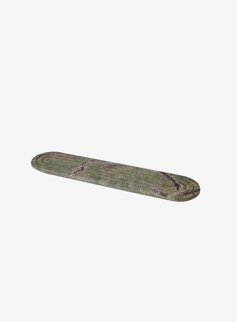 Part of the Rock collection of sculptural artefacts crafted from Green Forest marble by Tom Dixon, this long grooved chopping board or serving platter is designed to furnish kitchen counters and banqueting tables, equally perfect for preparing and presenting food. The pattern and texture of each piece is entirely unique and is a celebration of the individualistic nature of marble, whose veins of colour vary from piece to piece and are wholly dependent on the block of marble it was carved from.