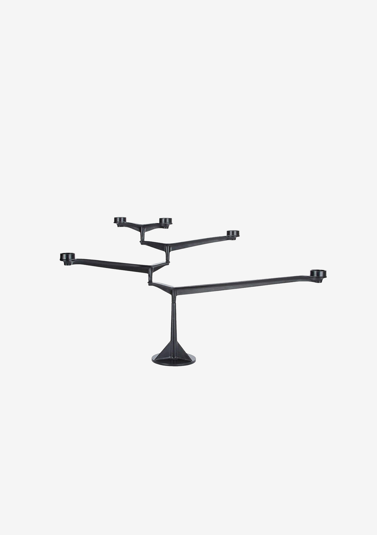Taking its construction from the robust components of bridges and engines from the Victorian era, Tom Dixon’s Spin Candelabra is an inverted mobile, and a revolution in candlesticks. Made from robust, honest indestructible cast iron, five candles can be placed on its extending arms. Its adaptable design that lends the Spin its name sees each arm spin to rest in different positions, producing infinite arrangements and giving it its iconic status and place in table-top engineering. The Spin Candelabra accomodates a variety of candle sizes such as tea light and tall candles.